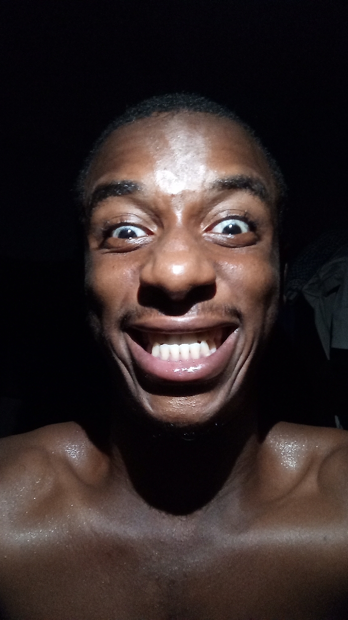 A close-up of a Black man with a wide, toothy grin and widened eyes. His skin glistens with moisture, particularly on his forehead and chest. The background is dark, casting shadows around his neck and shoulders. The man's expression is exaggerated, possibly conveying excitement or surprise. He has short hair.