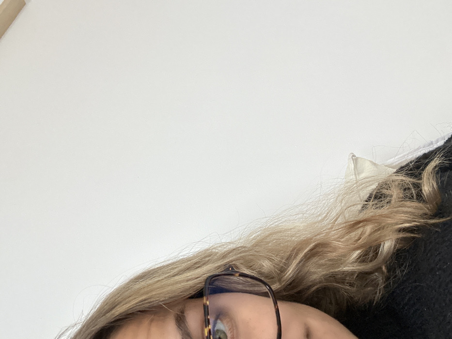 The image displays a partial, close-up view of an individual in an indoor setting within Veauchette, France. The subject, occupying the left third of the frame, is a person with wavy, light-colored hair, appearing blonde or light brown. The visible portion of the face includes the left eye with a green iris and the left eyebrow. The individual is wearing eyeglasses with tortoiseshell-patterned frames, the left lens and frame prominently visible. A dark, textured garment, resembling a sweater, is visible on the subject's lower left, with a white collar or undershirt peeking out near the right shoulder area. The background is a uniformly white, unadorned wall, filling the majority of the right and upper portions of the image. No specific actions or interactions are depicted; the individual appears stationary.