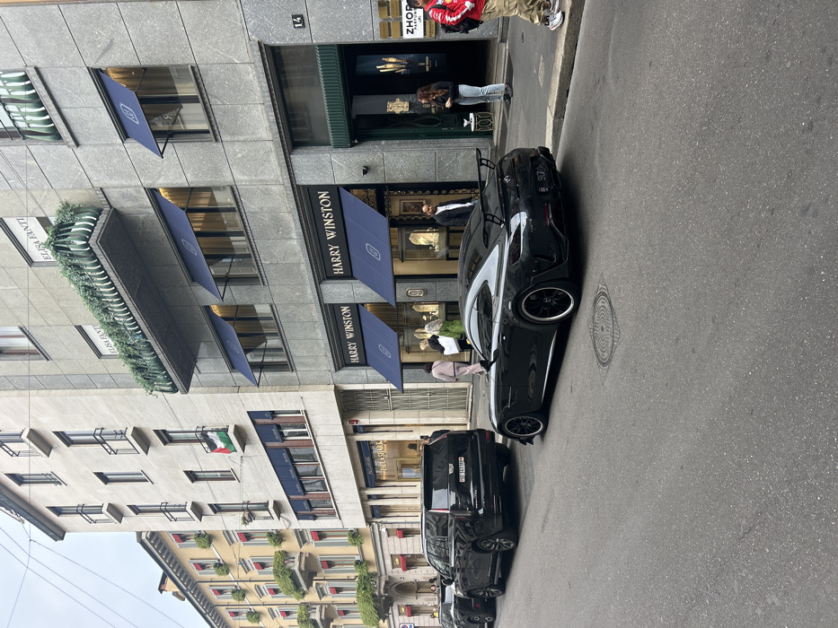 This image depicts a commercial street scene at Via Pietro Verri 14 in Milan, Italy, on an overcast day. The street features a grey asphalt roadway with a circular manhole cover, alongside a paved sidewalk. Three multi-story buildings line the right side of the street. The building at number 14 is constructed of grey stone, housing two "Harry Winston" storefronts on the ground floor, each with dark blue awnings and window displays. To the right of Harry Winston, a "ZHOP PARFUMS" entrance displays a vertical product advertisement. Above Harry Winston, windows with blue awnings are visible, topped by a balcony adorned with decorative greenery, where "ELISA FANTI" is signed. Adjacent to this, a lighter-toned, possibly beige, multi-story building houses "PAUL & SHARK" on its ground floor. From a third-story balcony of this building, a Palestinian flag (horizontal green, white, black stripes with a red triangle on the hoist side) is draped. Further left, a yellow-facade building with red window awnings and balcony planters is visible, with "CARTIER" partially discernible at ground level. Two primary vehicles are parked curb-side, facing away from the viewer. In the foreground is a black Mercedes-AMG GT R sports car, distinguished by a prominent rear spoiler and black multi-spoke wheels. Behind it is a black Cadillac Escalade SUV, bearing a Swiss license plate (GE 141381). A third dark SUV is partially visible further down the street. Approximately ten individuals are present. On the sidewalk near Harry Winston, a man in a dark jacket stands facing the street, while a woman in light jeans and a dark top stands near the Zhop entrance. A man in a red jacket, beige pants, and sneakers stands on the far right edge of the frame, facing away. Several pedestrians, including one person in a light green jacket and another in a light pink pantsuit, are walking on the sidewalk between the Harry Winston and Paul & Shark stores. One individual is visible inside the Paul & Shark store. No overt interactions are observable.