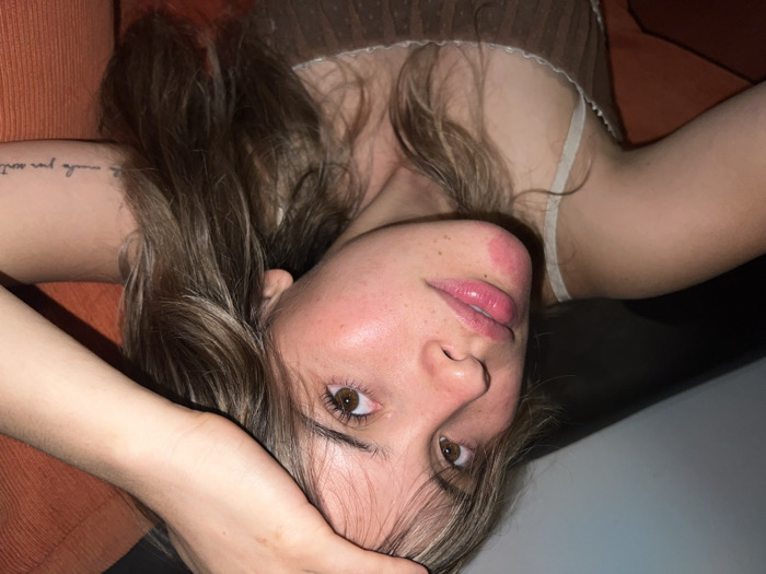 A woman with hazel eyes and light brown hair is lying down, looking up at the camera. She wears a tan tank top. Her left arm is raised, with her hand near her forehead. A tattoo is visible on her right arm. The background appears to be a couch with orange and dark surfaces. Her lips have a glossy sheen and a reddish mark is visible on her chin.