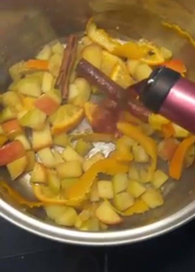 A top-down shot shows a stainless steel pot filled with diced apples, orange peels, and cinnamon sticks