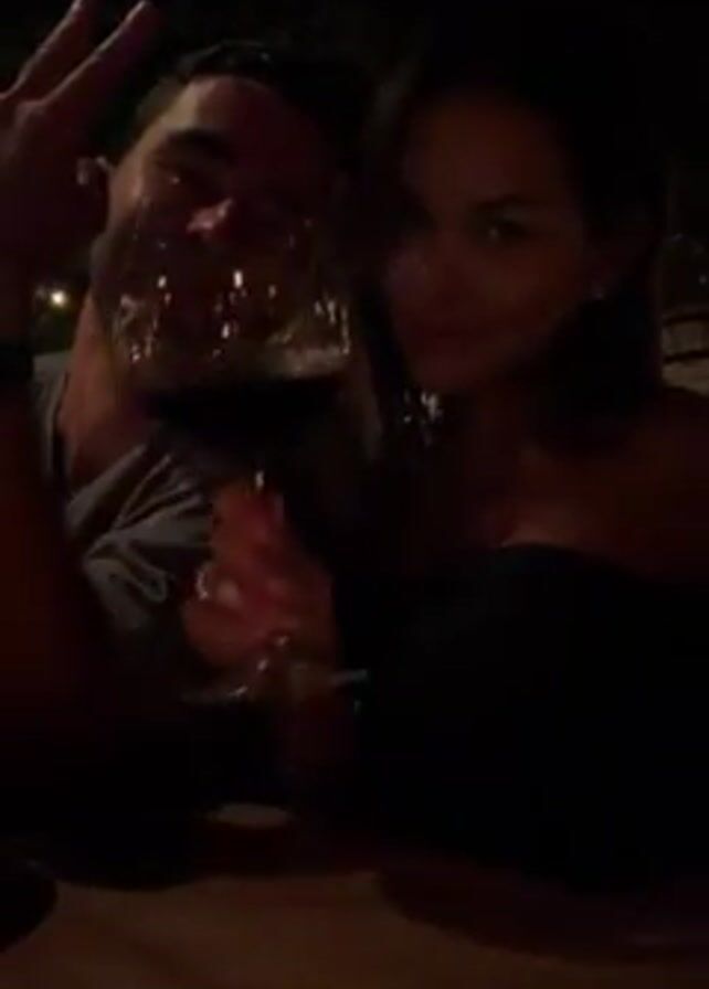 A dimly lit video shows a man and a woman sitting at a table outside. The man is making a peace sign with his fingers. He's wearing a gray shirt and a watch. The woman is holding a glass of red wine. She is wearing a black strapless top and smiling at the camera. A wooden table is visible beneath the glass. The background is dark. The video appears to be a selfie.
