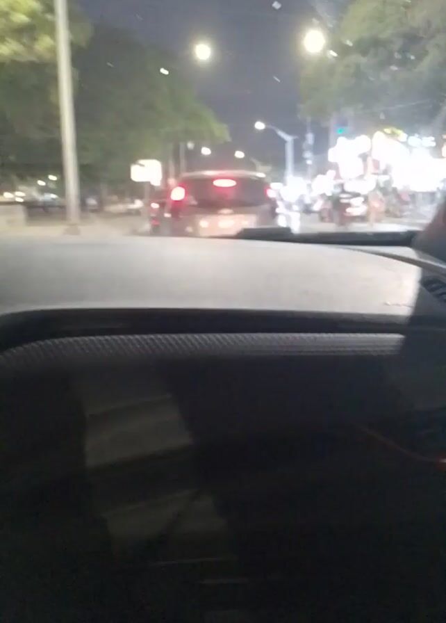 car stopped at a traffic light at night. The view is from inside the car, looking through the windshield. Streetlights illuminate the road and surrounding trees. Several vehicles are visible in front, including a silver car with its brake lights on. A sign indicating "Zona Electronica Vigilada" can be seen. The interior of the car is partially visible on the right side of the frame, including the side window and the dashboard.