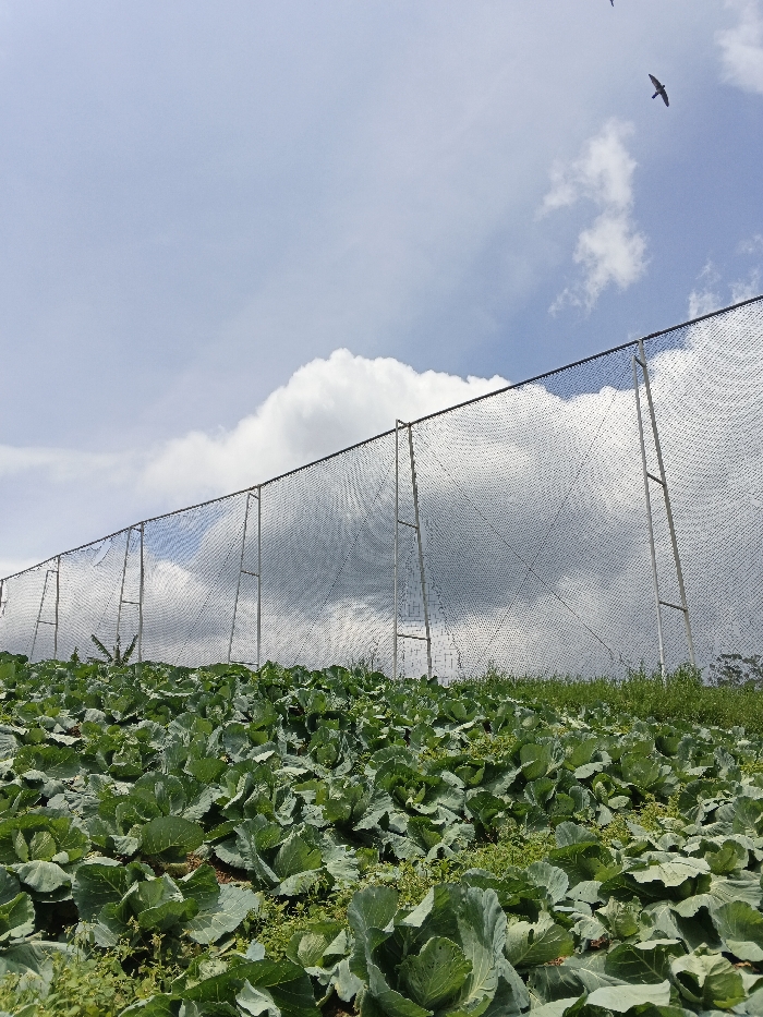 A field of green cabbages stretches towards a tall, netted fence supported by metal posts