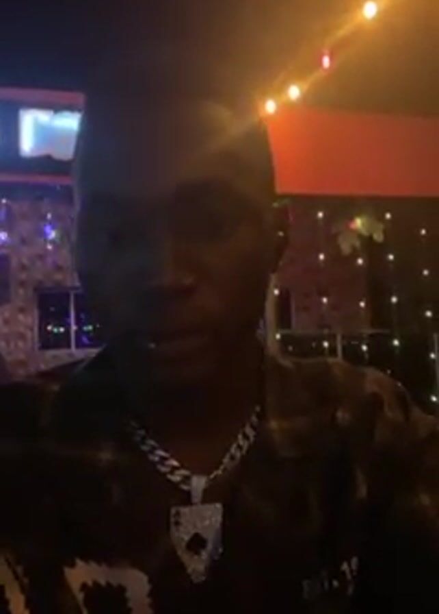 A person with dark skin and short hair is standing in what appears to be a bar or restaurant. They are wearing a dark jacket with white markings and a large silver chain with a spade-shaped pendant. The lighting is dim, with string lights visible in the background. A sign with the letters "B M" is also partially visible. The person seems to be looking directly at the camera and possibly speaking. The camera angle is slightly low, looking up at the person. There are festive lights visible in the background, suggesting it might be a holiday setting.