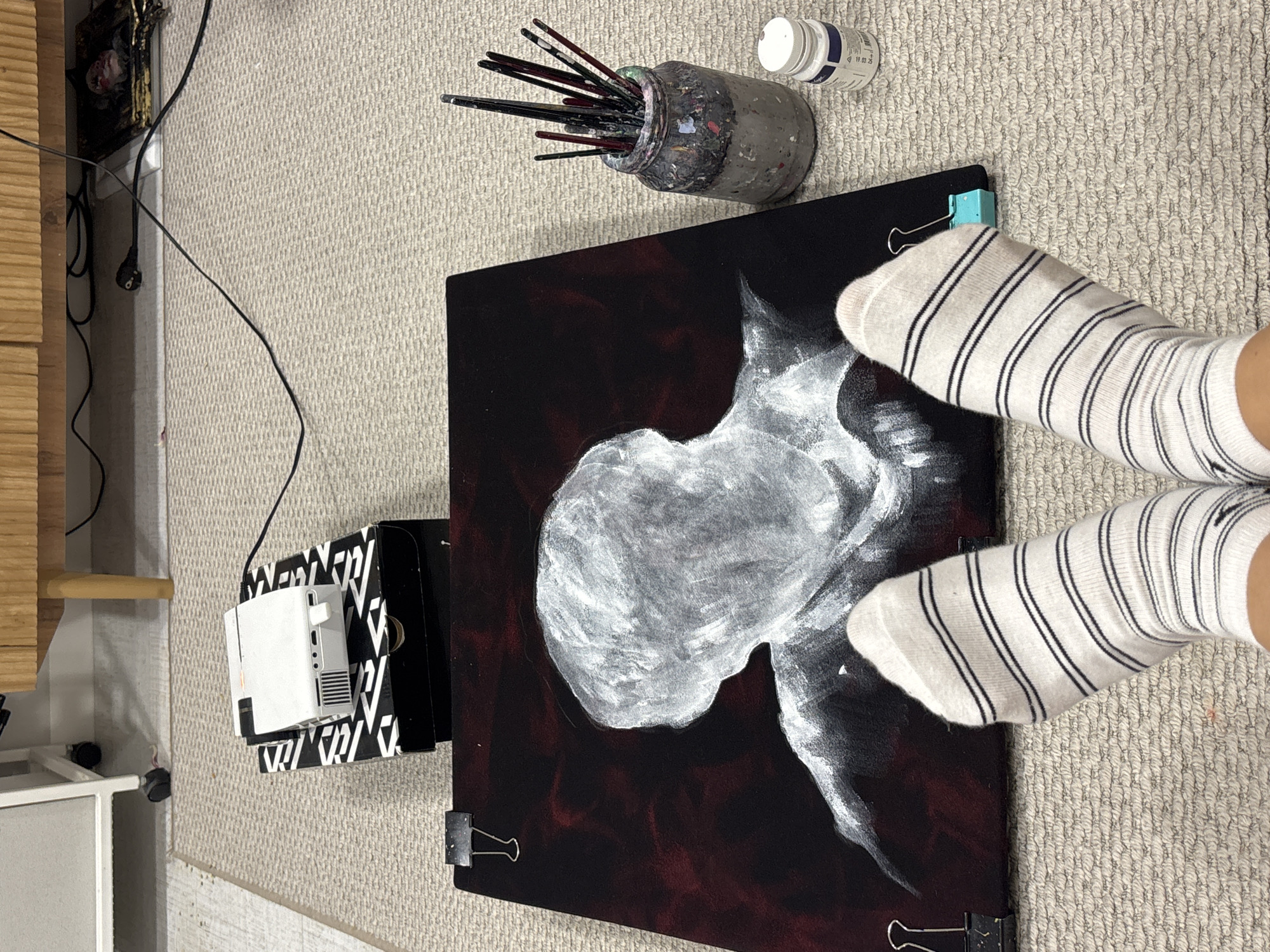 n indoor scene, possibly an art studio or a room being used for art purposes. A canvas is laid out on a beige carpeted floor. The canvas features a painting in progress, with a dark red background and a white shape resembling a ghost-like figure dominating the center. Paintbrushes are arranged in a jar next to the canvas, along with a jar of white paint. A projector is positioned next to the canvas. The bare feet of an individual wearing white socks with black stripes are near the edge of the canvas. Metal clips are securing the canvas to a black backing. The overall environment is simple and seems focused on the artistic activity taking place. There is no information about the location in the city of Krasnoyarsk, Russia.
