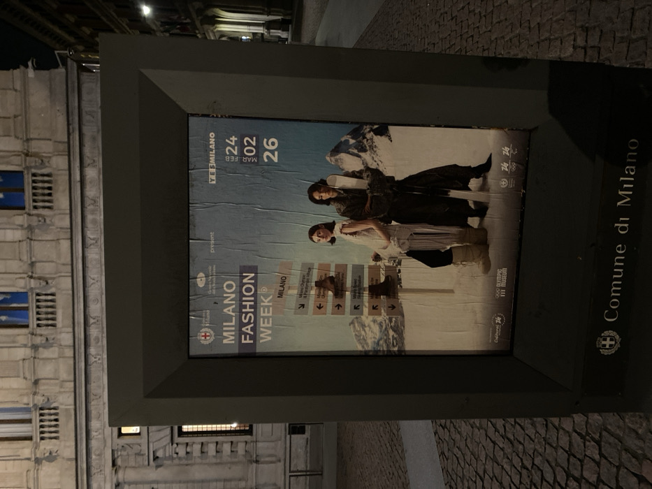 - "An illuminated, dark gray, rectangular outdoor advertising kiosk stands at the center of the image, positioned on a cobblestone street at night in Milan, Italy" by FM-KiN8j2, licensed under CC BY 4.0