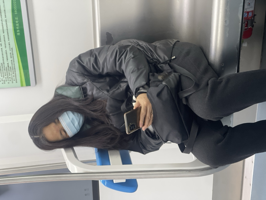 A person wearing a face mask, black jacket, and sweatpants sleeps on a train. Their head rests on a blue and white seat. They are holding a gold-colored smartphone. A black bag with straps is nearby. A silver wall is behind the person and a green and white sign is to the side. A red fire extinguisher is partially visible in the background.
