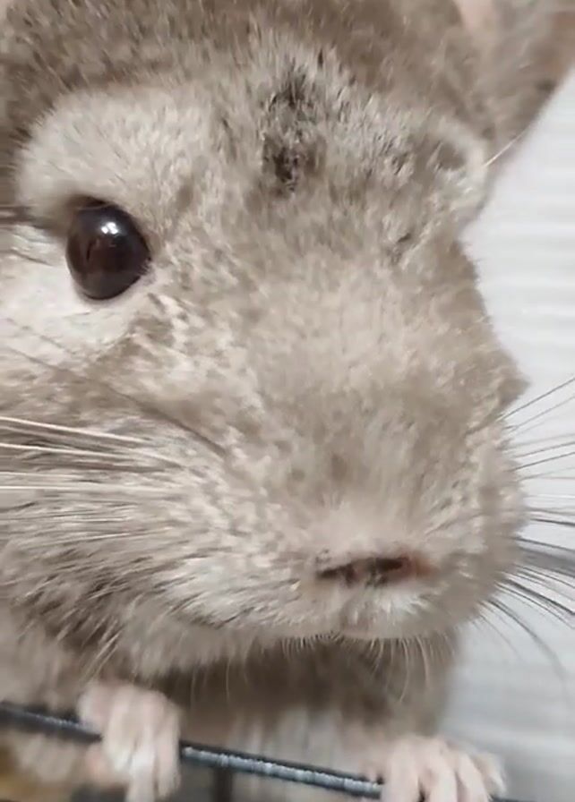 A close-up shot features a gray chinchilla inside a wire cage