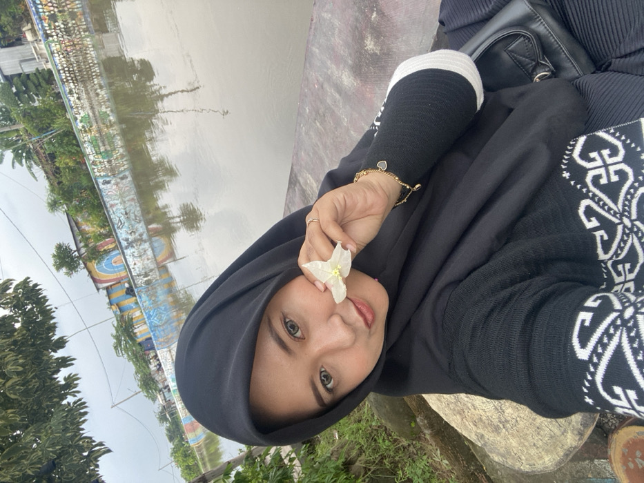 A female individual is captured in a medium close-up shot, seated outdoors beside a body of water in Kalitengah, Indonesia