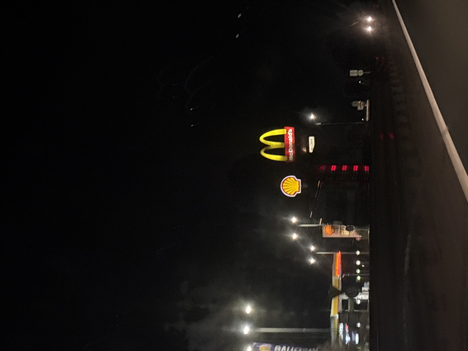The image depicts a nighttime roadside scene in Studena, Bulgaria, viewed from a low angle, likely from a vehicle. Dominant features are illuminated commercial signs: a prominent yellow McDonald's "M" logo above "McDonald's" text in red, and a yellow Shell scallop shell logo positioned to its left. Further left, a Shell gas station is visible with a brightly lit canopy, associated structures, and a vertical red-lit sign, possibly indicating prices. Multiple tall streetlights illuminate the area. A white solid line, indicative of a road marking, runs diagonally across the lower right foreground. On the far right, two distinct headlights from a vehicle are visible. No people are discernible within the frame.