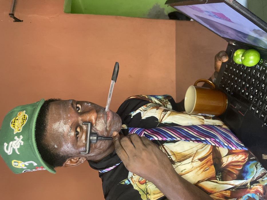 An adult male is depicted indoors in Mosafejaw, Nigeria, against an orange-brown wall with a green wall section visible to the right. The male has dark skin with white residue on his face, specifically on the cheeks, chin, and forehead. He wears a green baseball cap adorned with multiple white patches and logos, including "SOX". He is dressed in a black short-sleeved collared shirt featuring a light-colored print depicting sailing ships, and a striped tie in shades of blue, purple, and white. His left hand holds a black T-shaped razor against his right cheek, while a transparent ballpoint pen is held horizontally in his mouth. His right hand rests on the keyboard of a black laptop. A brown ceramic mug and two small, spherical green fruits are positioned on the laptop's keyboard. The laptop screen is angled upwards and displays a colorful image or video. A dark fixture, possibly a hook, is mounted on the orange-brown wall in the upper right background.
