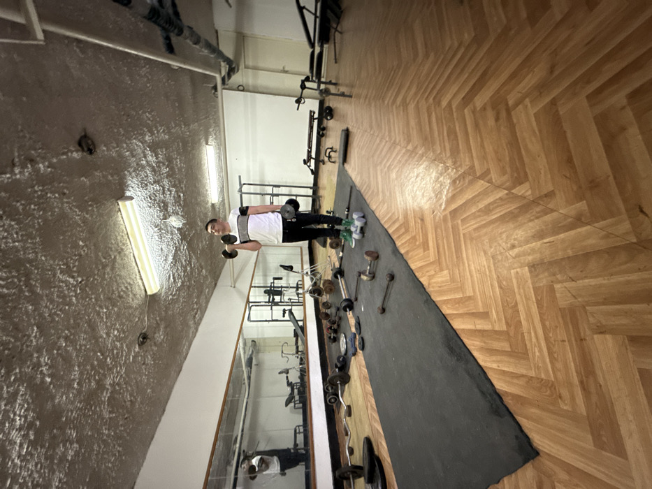 The scene depicts an indoor fitness facility or gym located in Sliven, Bulgaria. One male individual, appearing to be in his 20s or 30s, stands centrally on a dark grey rubber mat laid over a light brown herringbone parquet floor. He wears a white t-shirt with black chest and sleeve accents, black trousers, and light green athletic shoes. The individual is actively engaged in weightlifting, holding a black dumbbell in each hand; his right arm is partially flexed, raising the dumbbell to chest height, while his left arm is extended downwards, holding a second dumbbell near his hip. The room's left wall features a large, unframed mirror reflecting the subject and parts of the gym interior. The ceiling is textured, possibly a popcorn or stucco finish, painted an off-white or light grey, with two exposed fluorescent light fixtures providing illumination. Exposed pipes or conduits are visible running along the upper portion of the far wall. Various weightlifting equipment is scattered across both the rubber mat and the adjacent parquet floor, including multiple dumbbells of varying sizes and colors (black, silver, green), several barbells (straight and EZ curl bars), and circular weight plates. In the background, along the far and right walls, additional gym apparatus such as weight benches, a squat rack, and other exercise machines are present, some partially obscured. A white door is visible on the far right.