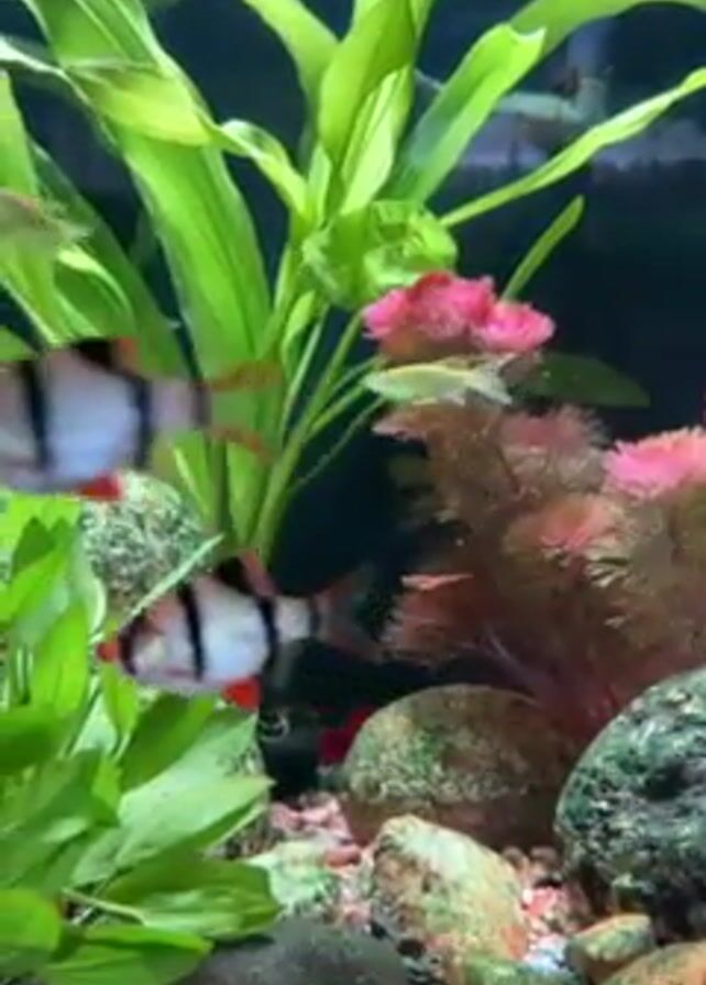 n aquarium with several tiger barbs swimming among green plants and artificial pink coral