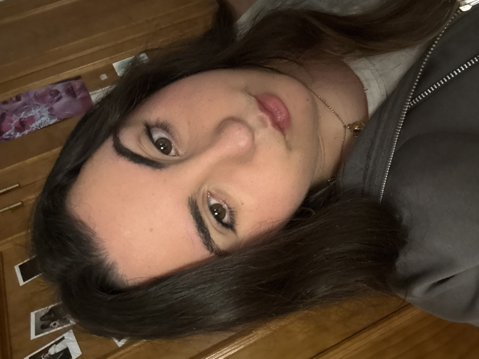 A young woman with long brown hair, fair skin, and light brown eyes looks directly at the camera. She wears a gray hoodie and a gold necklace. Her makeup is minimal. She is lying down, with her head resting on what appears to be a wooden surface, possibly a dresser or a table. The angle of the photo is tilted. Small photos or postcards are visible on the wooden surface beneath her.