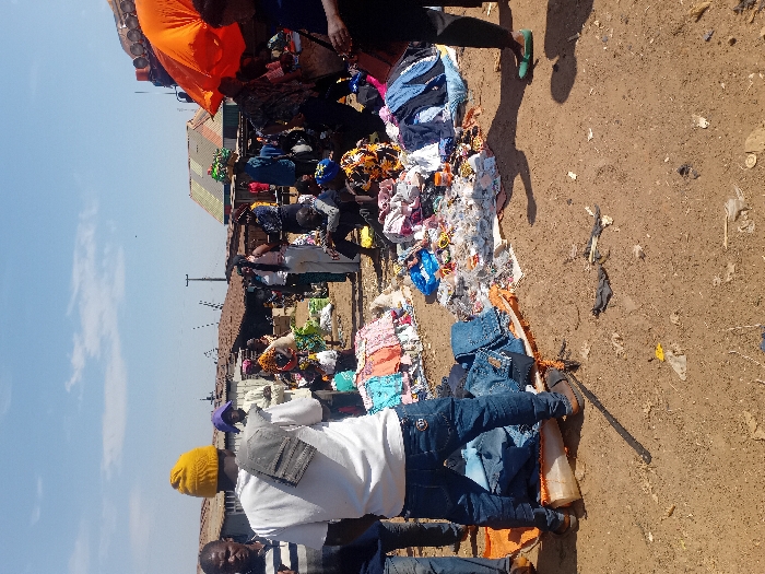 The image portrays an outdoor market scene in Jos, Nigeria, under a clear, bright blue sky