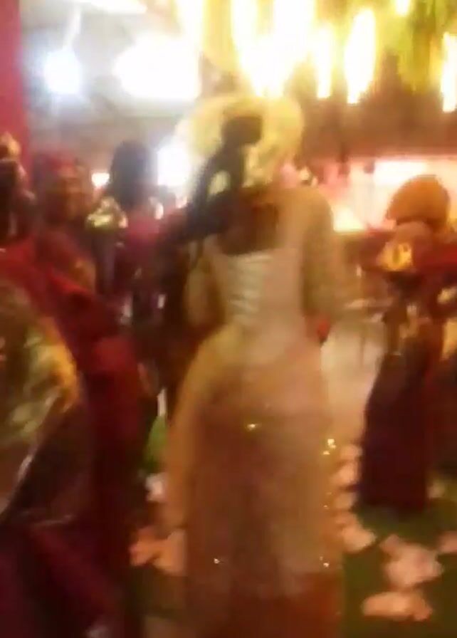 A brightly lit, indoor scene shows multiple people dressed in elaborate, colorful clothing. The focus is on a woman in a sequined, cream-colored dress who is dancing. There are other women dressed in red and gold fabrics surrounding her. Scattered on the floor beneath them appear to be bills of money. The lighting is bright and a bit overwhelming, causing some of the details to be obscured. The atmosphere seems festive, with music likely playing as the people dance.