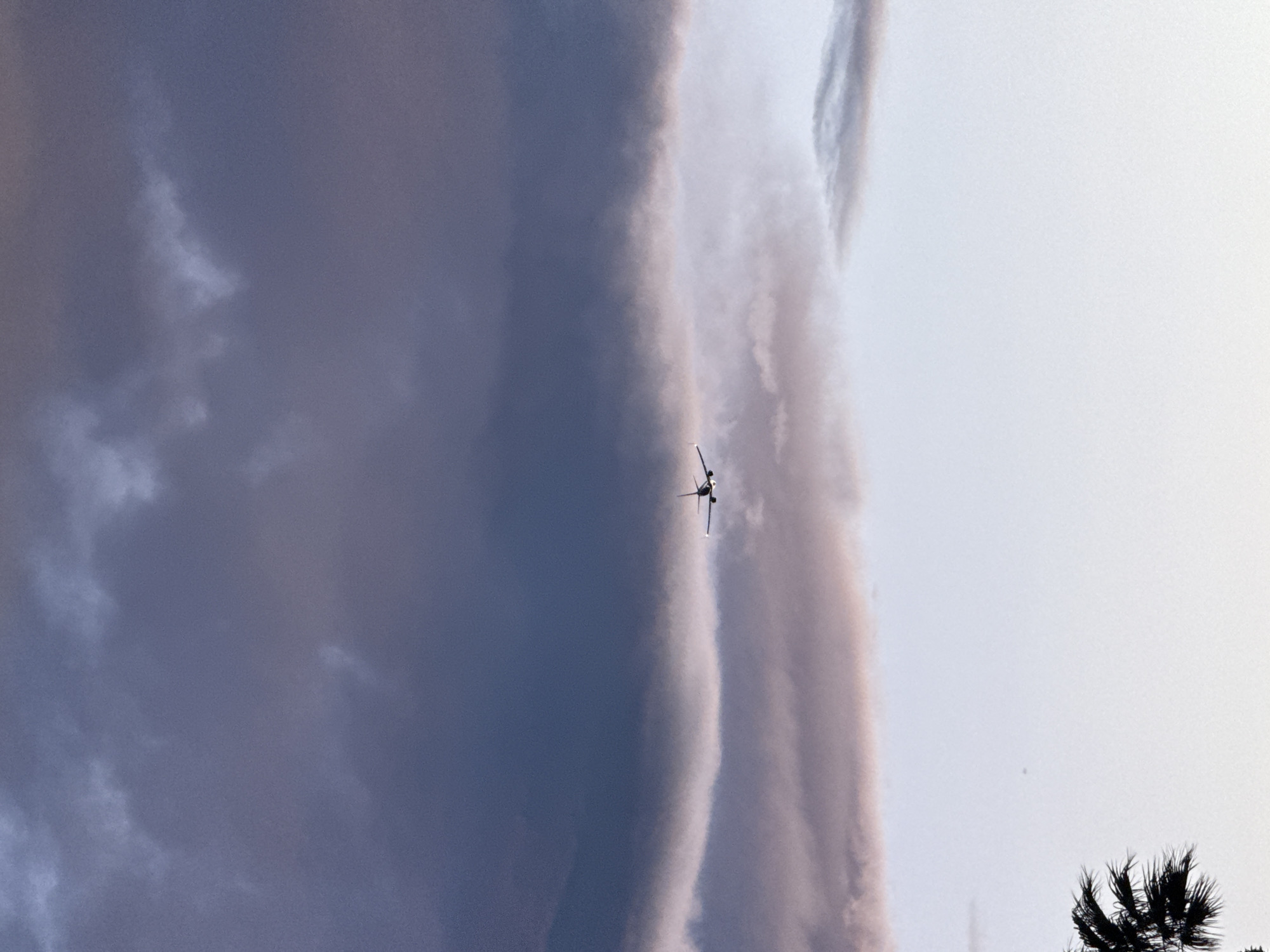 A horizontal, eye-level photograph shows a dark-colored jet aircraft flying in a vertical orientation amidst atmospheric conditions. The aircraft has wings that are nearly perpendicular to its fuselage, and it appears to be captured mid-flight. The backdrop includes a dark, cloudy sky on the left and a lighter, brighter sky on the right, with wisps of clouds separating the two. The bottom-right corner features part of a silhouetted palm tree. The image was taken in the city of Paradise, United States of America.