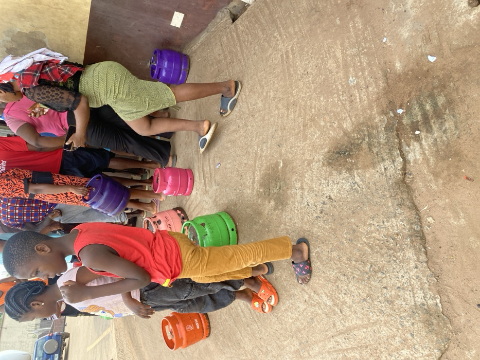This image depicts a bustling outdoor scene in Onitsha, Nigeria, likely at a gas refilling or exchange point. A group of individuals, including adults and children, are visible, many standing alongside multiple brightly colored liquefied petroleum gas (LPG) cylinders. In the foreground, a boy wearing a red sleeveless top, mustard-colored pants, and dark slides faces right, slightly ahead of a girl with braided hair, a light-colored top, dark pants, and orange slides. Behind them, two orange gas cylinders sit on the ground, along with a green cylinder near the boy's feet. Further back, a line of adults is present. One individual wears a blue and orange patterned top, another a red t-shirt, and a third a pink top and black pants. A person carries a purple LPG cylinder. To the right, a woman in a black lace top, a light green patterned skirt, and open-toed slides holds a mobile phone. She has a white cloth on her head, and her right foot is lifted slightly. Another purple gas cylinder rests on the ground near her. The ground is a rough, uneven concrete surface with dirt and minor debris. A light-brown building wall forms the backdrop on the right. In the far left background, a blue car with a rear-mounted spare tire is partially visible. The scene suggests a communal waiting area, possibly for gas services, given the numerous cylinders present.