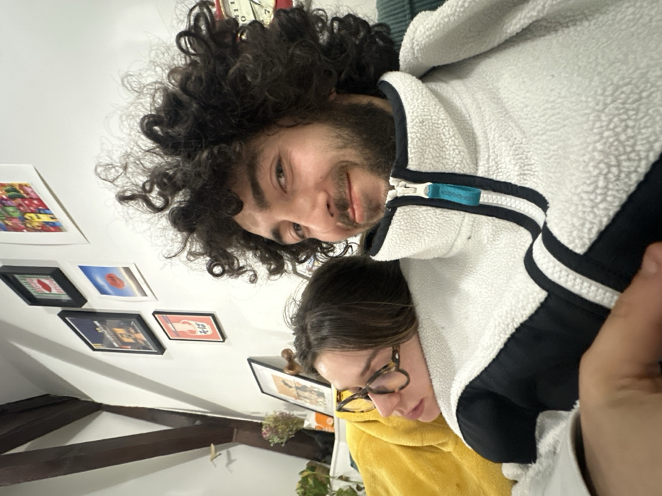 A selfie features two people: a man with dark, curly hair and a beard smiles at the camera, wearing a white and black fleece jacket. Underneath him, a woman with brown hair wears glasses and a yellow hoodie. They are indoors, with a white wall displaying several framed artworks in the background. A partially visible wooden beam and some potted plants are also present. The image is rotated.