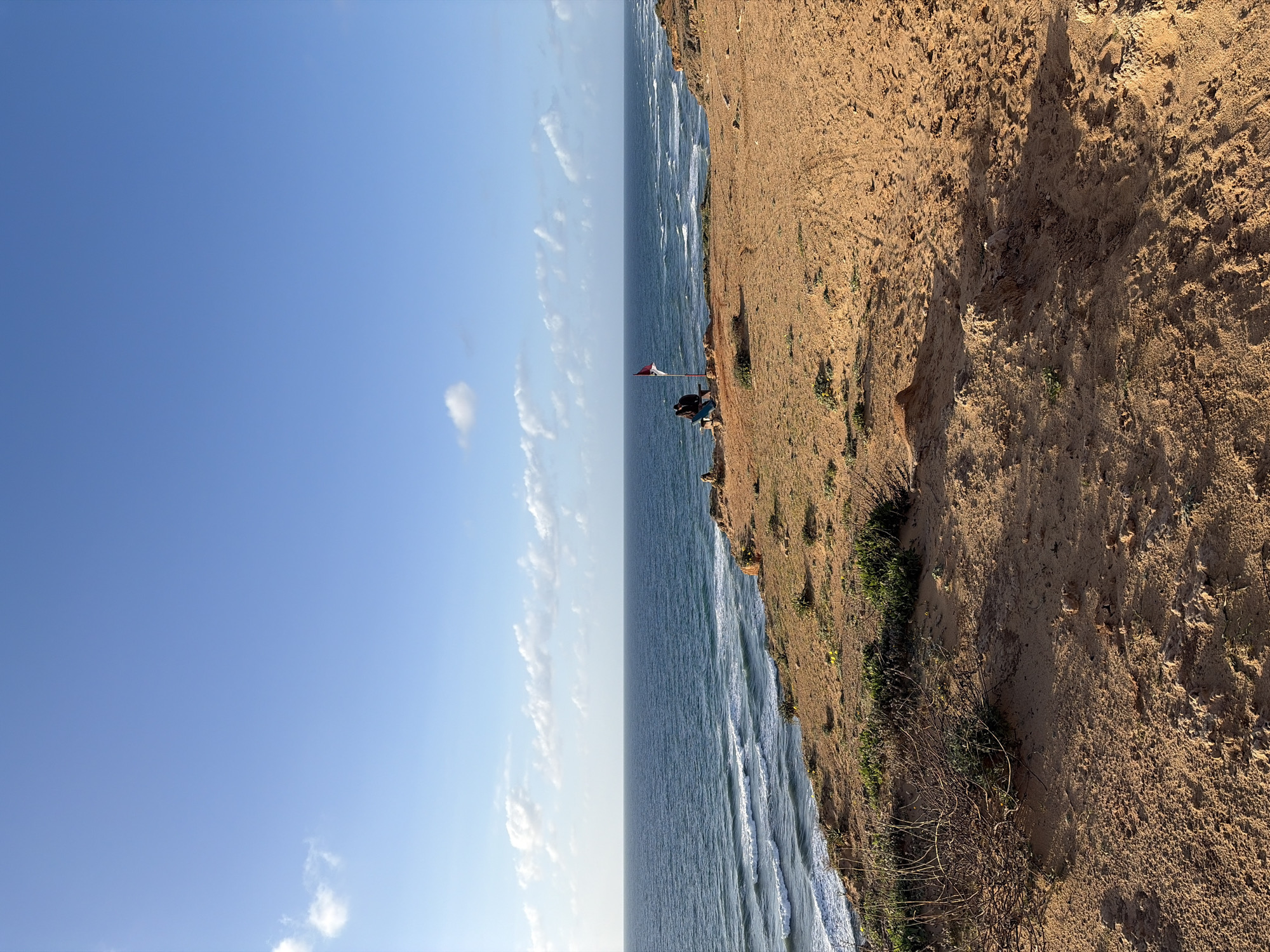 A horizontal panoramic view captures the Israeli coastline at Arsuf. Clear blue sky occupies the left portion of the frame, contrasting with the deep blue of the sea extending vertically to the center. White waves gently crash against a sandy cliff that forms the right side of the image. Two individuals are seated at the cliff's edge, near a red-and-white striped flag. The cliff is covered with dry, sparse vegetation. The sand appears coarse and textured.