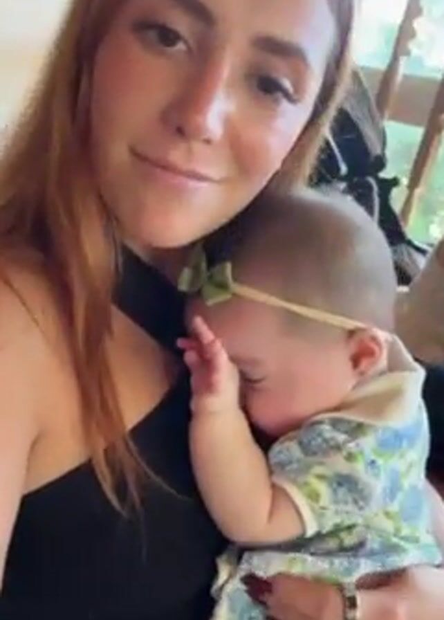 A woman with reddish-brown hair holds a baby in her arms. The baby is wearing a light blue floral dress and a thin headband with a small green bow. The baby has a hand near its face. The woman looks at the camera and then kisses the baby on the head. The baby then opens its eyes. They appear to be indoors, potentially in a restaurant, as other people and tables can be seen in the background.