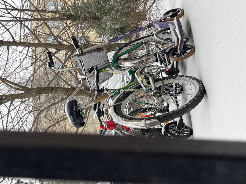 The scene depicts a snowy outdoor environment in Saint Petersburg, Russia, during what appears to be winter. The ground is covered with a layer of white snow. In the immediate foreground, a dark vertical object, possibly a fence post or wall, partially obscures the left side of the frame. The primary subjects are three snow-covered personal transportation devices. From left to right: 1. A children's bicycle, largely obscured by the foreground object, with a visible red rear reflector, a chrome rear mudguard, and a black saddle bearing the "STELS" brand. Its rear wheel features a prominent tread pattern and a training wheel with silver-spoked black rims is attached near the rear axle. Snow covers its frame, saddle, and wheels. 2. A second bicycle, positioned behind and to the right of the first, with a green and yellow frame, curved handlebars, and a black mesh front basket. Its components are also dusted with snow. 3. A purple scooter, standing upright on the far right, with two wheels featuring brown-colored tires. Snow has accumulated on its deck, wheels, and frame. In the background, several bare-branched trees are visible, indicating deciduous trees in a winter state. Beyond the trees, a light-colored building with multiple windows can be discerned, partially obscured by the branches. A small evergreen shrub or tree is visible to the right, also bearing a light dusting of snow. There are no people present in the image.