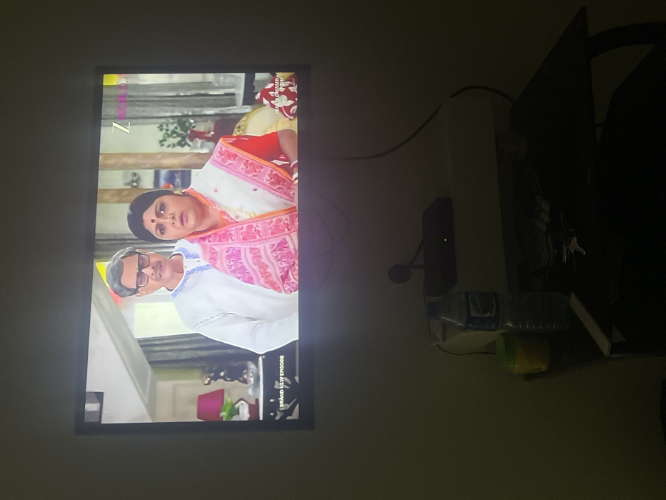 A television screen displays a scene from a show, featuring an older man with glasses and a woman in a white and pink sari. The show appears to be an Indian drama based on the traditional clothing and styling. To the right of the TV, a dark, blurred background reveals a router and a water bottle resting on a small container. The overall setting appears to be a dim, indoor space.