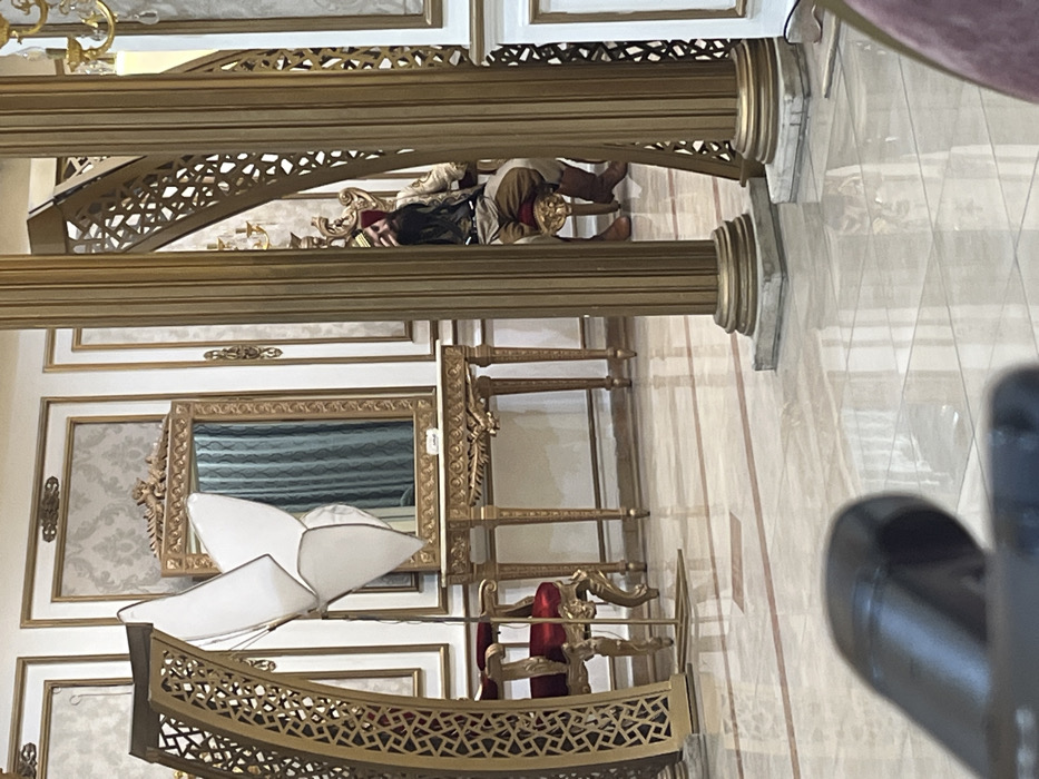 This image depicts an ornately decorated interior space in the city of Babella, Syria. The floor consists of polished, light-colored marble or tile with darker linear inlays. The walls are white or cream-colored, featuring gold-trimmed rectangular and oval decorative panels. In the left mid-ground, a gold-colored arched structure with a geometric lattice pattern is present. Adjacent to this arch, a floor-standing studio softbox, shaped like a large white flower with multiple lobes, is positioned with a visible black power cord. Behind the softbox, a red velvet armchair with ornate gold-colored wooden or metal framework is partially visible. Further back, against the wall, is a gold-colored console table with a white marble top, featuring carved embellishments, including a central lion's head motif. A small white rectangular object rests on the table. Above the console table, a large, ornate gold-framed mirror reflects a teal or light blue-green curtain. In the right mid-ground, two fluted gold-colored columns with white bases and gold capitals stand, partially obscuring the background. Behind these columns, another gold-colored archway with a geometric lattice pattern is visible. A chandelier is partially visible in the upper right. A single individual, an adult male, is seated in a red, throne-like chair with gold-colored accents, positioned behind and partially obscured by the rightmost gold column. The male has a dark beard and mustache, and wears a red fez or similar head covering. He is dressed in a light-colored tunic or robe, brown trousers, and brown boots. His left hand rests on his lap.