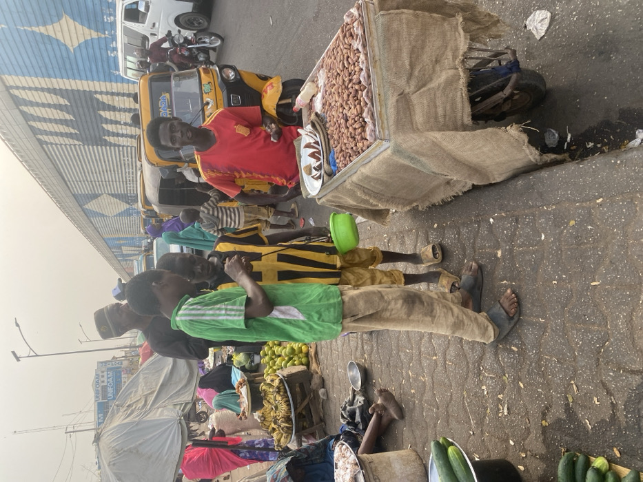 A bustling street scene features vendors and passersby. A man in a red shirt stands beside a cart filled with peanuts, while another person in a green shirt looks on. Vendors display bananas, oranges, and cucumbers. Auto rickshaws line the road in the background, creating a vibrant and lively atmosphere. The scene depicts a typical day in a bustling market.