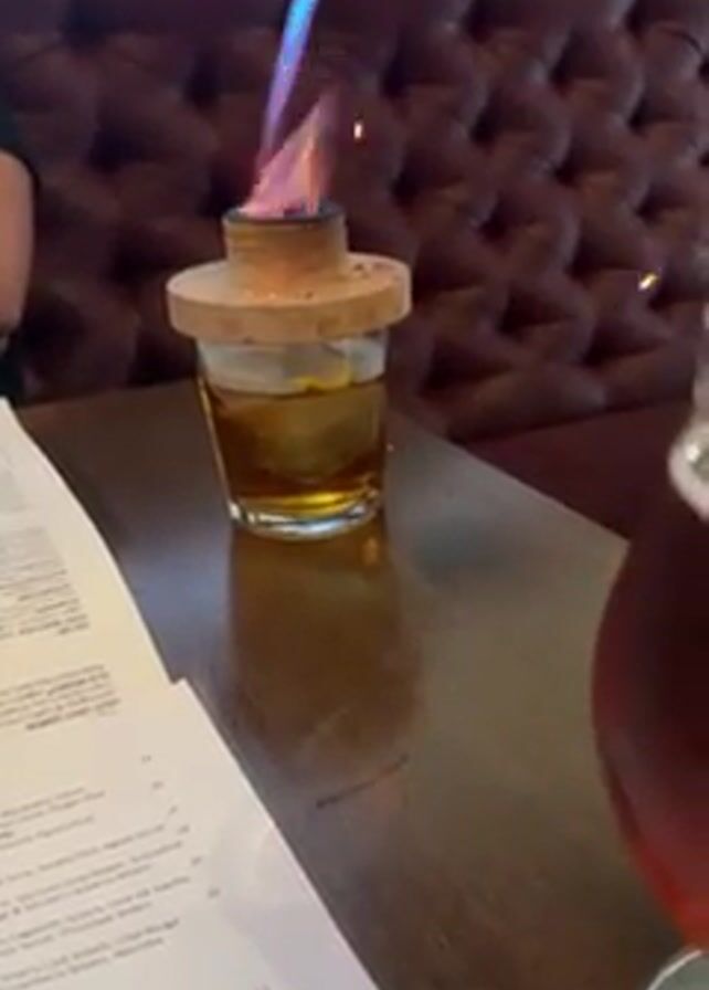 hand holding a torch lighter with a blue flame burning the wood of a cocktail smoker placed on top of a glass of amber-colored liquid. A menu and another glass of amber liquid are also on the dark brown wooden table. The background is a tufted burgundy leather booth seat.