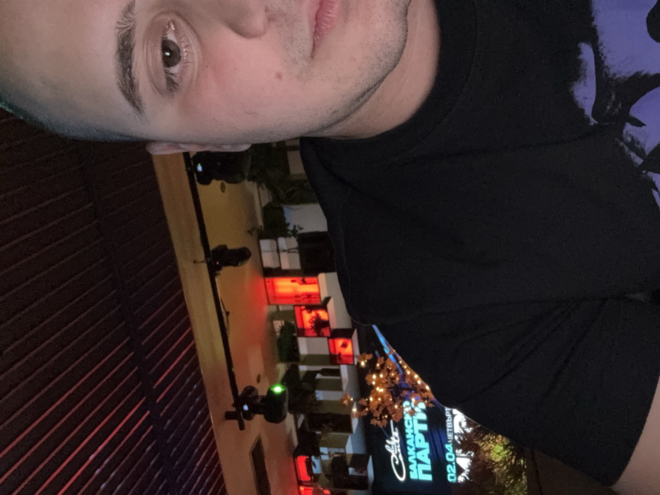 The image displays a close-up, partial view of a male subject in what appears to be an indoor entertainment venue