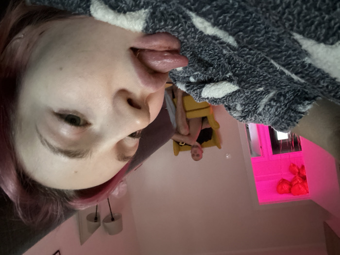 The scene depicts an indoor residential setting in Vsevolozhsk, Russia. In the foreground, a female individual with pink-dyed hair and light skin is positioned on the right side of the frame, partially covered by a gray and white patterned blanket. Her mouth is open with her tongue extended. In the midground, a bald male individual is seated in a yellow armchair. He is wearing a dark shirt and light-colored lower garments, exposing his thighs, with his legs crossed, and is looking towards the left. To the left of the frame, an open doorway leads into an adjacent room or hallway illuminated with a strong pink light, where multiple red heart-shaped balloons are visible. The room containing the male individual has white walls, and a lamp with a light-colored shade is partially visible in the upper right background.