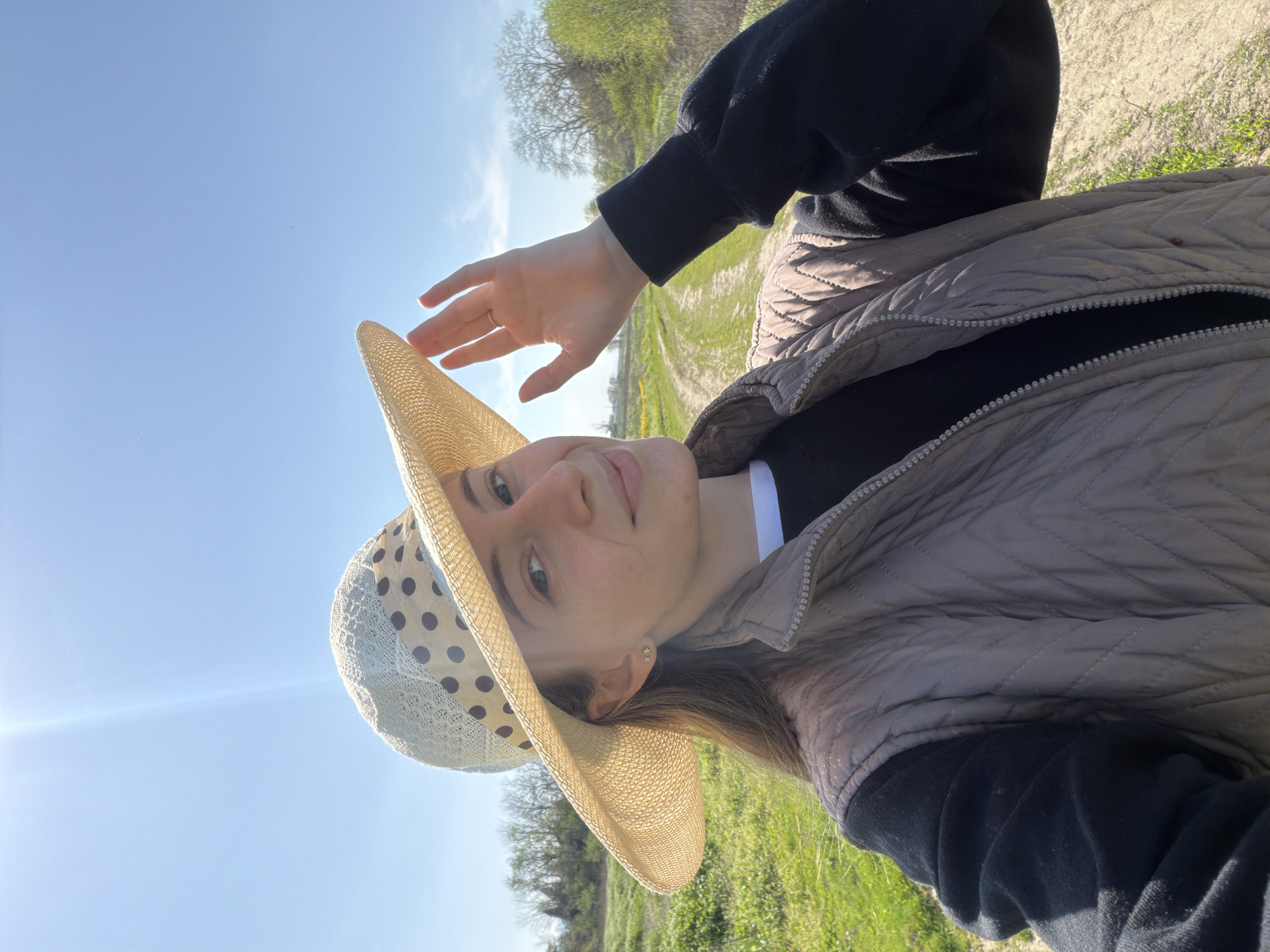 A woman in a straw hat and vest is standing on a grassy path near Milevo, Bulgaria, with trees in the background and a clear sky overhead