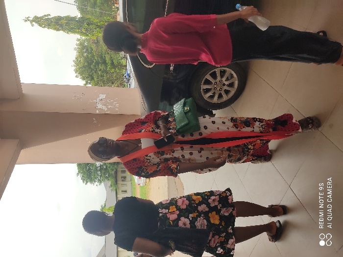 Three women stand near a vehicle outside a building. One woman wears a pink top and dark pants, holding a water bottle. Another wears a floral dress with a red strap and carries a green purse. The third woman wears a black top and a floral skirt. The building has a beige exterior with a visible pillar. A long tree is visible in the background. The scene is captured from a slightly elevated angle.