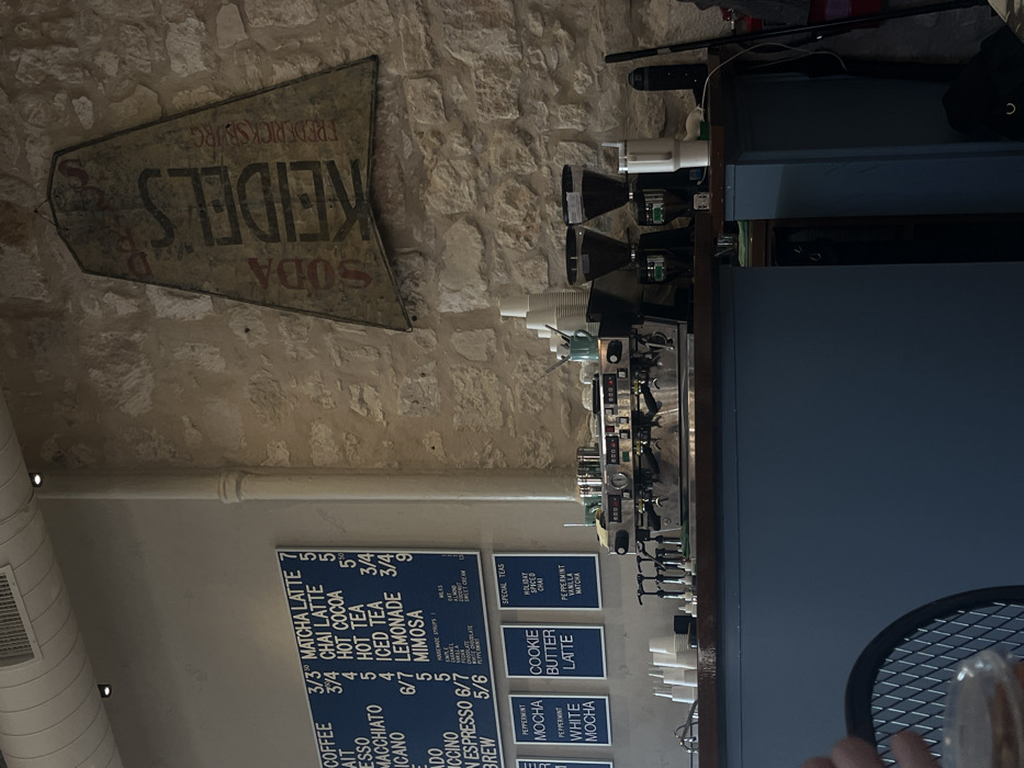 A vintage "Keidel's Soda" sign hangs on a stone wall, next to a coffee shop menu listing various drinks and their prices: coffee, matcha latte, chai latte, hot cocoa, hot tea, iced tea, lemonade, and mimosa