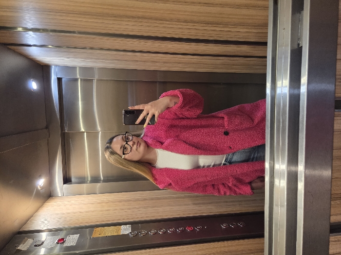 A female individual is depicted taking a mirror selfie inside an elevator in Veliko Tarnovo, Bulgaria
