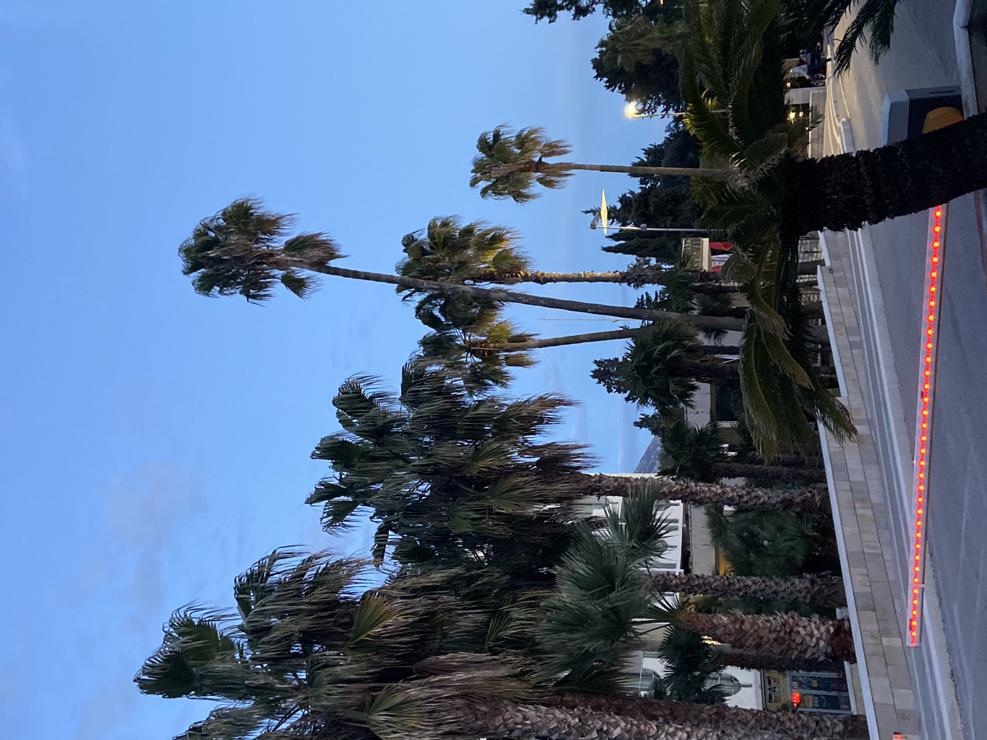 The image depicts a street in Bečići, Montenegro, lined with palm trees swaying in the wind