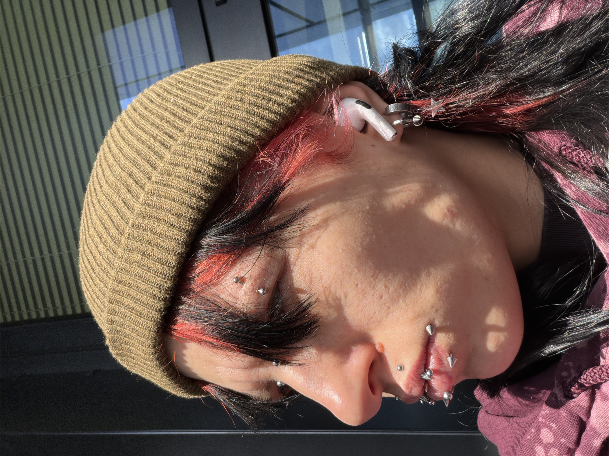 A close-up, profile photograph taken in Busmantsi, Bulgaria, depicts an individual illuminated by direct sunlight, facing left. The subject wears a light brown ribbed beanie hat over long dark hair with prominent red streaks. Numerous metallic piercings are visible across the face: at least two spherical studs on the right eyebrow, one below the right eye, one above the upper lip, and a cluster of spherical and pointed studs adorning both the upper and lower lips. A raised, fleshy lesion is observed on the right side of the nose. A white Apple AirPods Pro earbud is seated in the right ear, below which two silver-colored earrings are present: a hoop with a small dangling sphere and a ring with a transparent star-shaped charm. The individual wears a dark reddish-purple textured garment. The background features a dark vertical structure on the left and a window or glass pane with horizontal blind shadows and a sky reflection on the right.