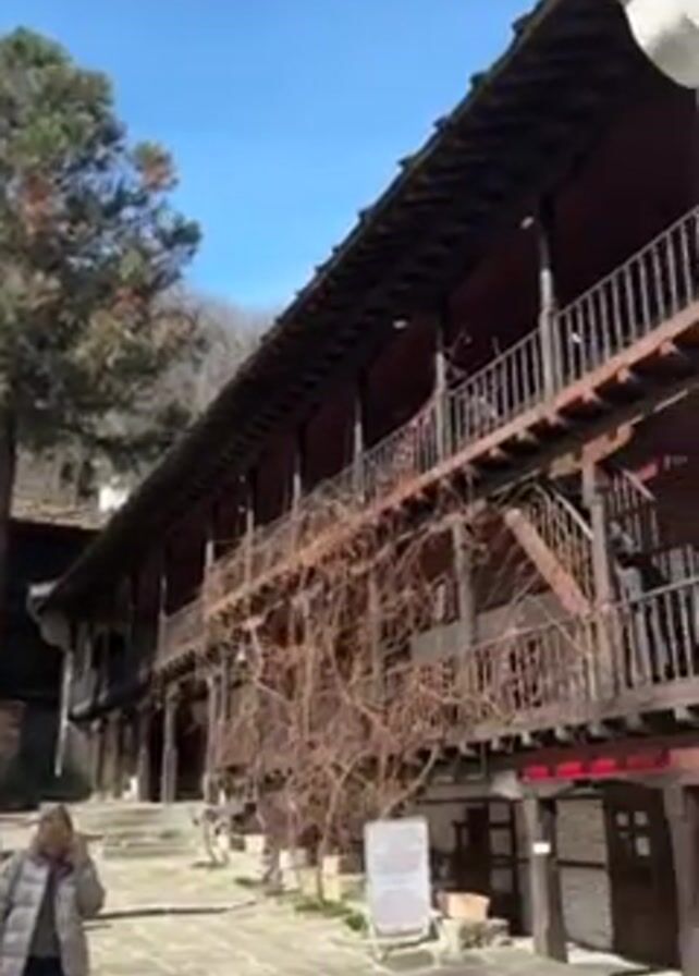 inner courtyard of a multi-story building, possibly a monastery or historic site. The building has a rustic design with stone walls and wooden balconies and staircases. Several people are visible, including individuals walking through the courtyard and one sitting on a bench. A tall tree is positioned in the center of the courtyard, adding to the serene atmosphere. The sky is clear and blue, suggesting a sunny day. The video pans up, revealing more of the building's structure and details.