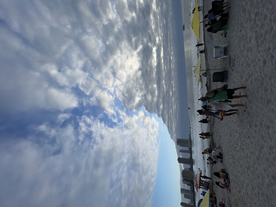 A beach scene with numerous people under yellow umbrellas. Buildings line the coast. The sky is mostly cloudy, transitioning from light blue near the horizon to heavy, textured clouds overhead. The image is rotated 90 degrees counter-clockwise, with the beach on the right and the sky on the left.