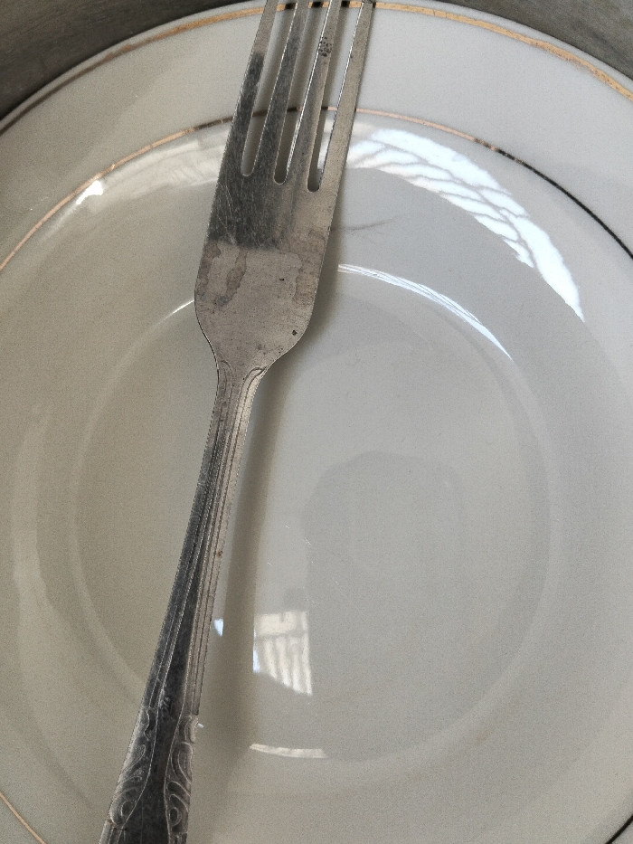 - "A top-down close-up shows a silver fork resting on a white plate with a gold rim" by FM-ooOYw1, licensed under CC BY 4.0