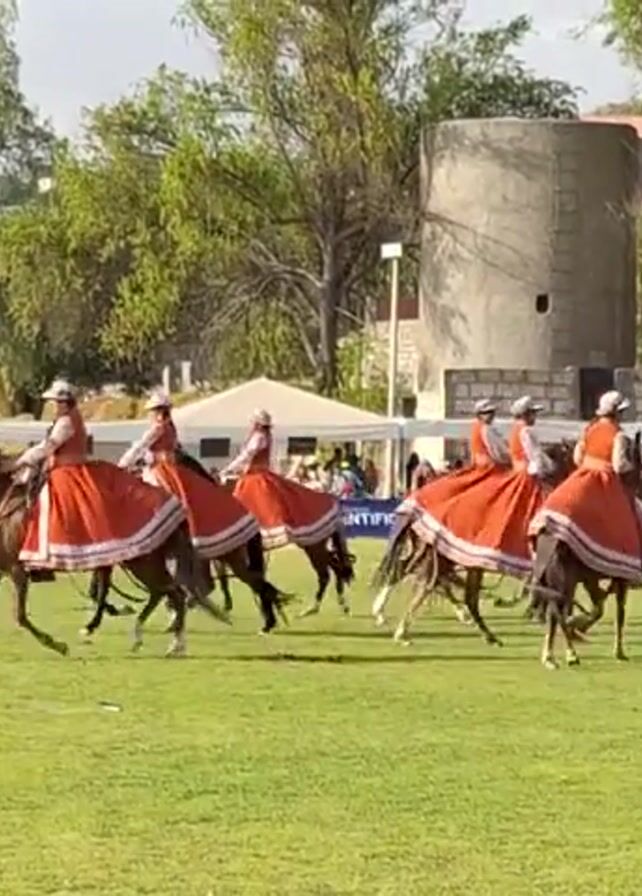 On a sunny day, a group of women are riding horses across a grassy field. They are wearing traditional attire: white hats and long orange skirts with white trim. The horses are brown. The group of riders trots in a line, moving from right to left across the frame. In the background, there are trees, tents, and people watching the display. A round, gray building resembling a tower is also visible. A banner with logos is positioned behind the crowd. The overall atmosphere is festive and celebratory.
