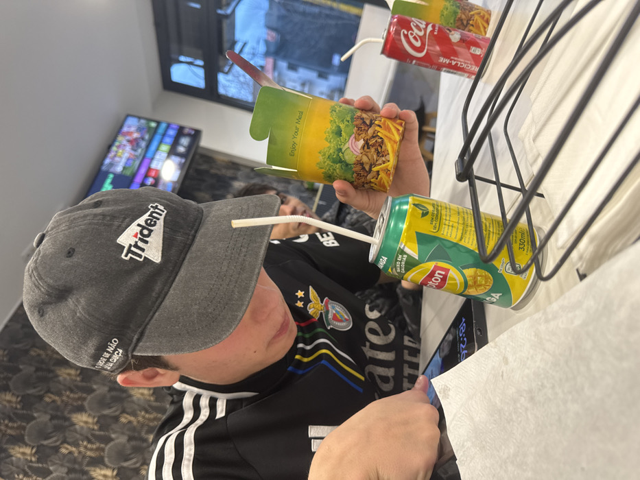 An indoor scene is depicted within what appears to be a fast-food establishment in Mirandela, Portugal. The primary subject, a young male wearing a black Adidas Benfica football jersey and a faded grey baseball cap with "Trident" branding and Portuguese text, is observed from the chest up, looking downwards at a smartphone held in his left hand. The smartphone's screen is illuminated, displaying the time "18:26." His right hand holds a green and yellow paper food container featuring an illustration of fries, shredded meat, lettuce, and onion, with the text "Enjoy Your Meal." A 330ml can of Lipton Ice Tea (Manga flavor, low calories), with a white plastic straw inserted, rests on the white tabletop near his left hand. Partially visible behind the primary subject, to the right, is another individual. Further to the right on the table, a red Coca-Cola can with a white straw, and another similar food container and drink can, are present. The background features a dark patterned wallpaper on the left wall, a wall-mounted television displaying a grid of colored sections, and a window on the right revealing an outdoor setting under ambient light. White paper napkins and a black wire frame object are also visible on the table.