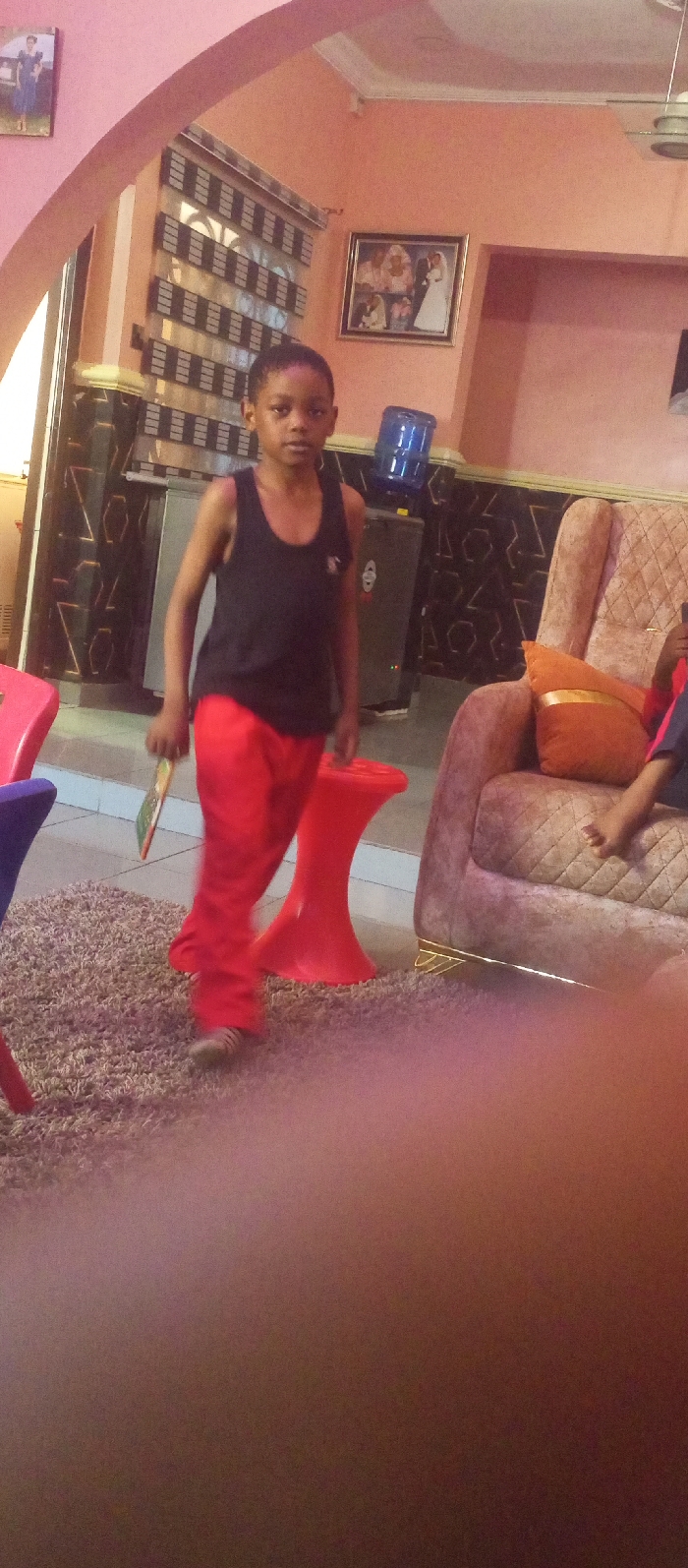 This image depicts an interior scene, presumably a living room or common area, located in Narayi, Nigeria. The room features peach-colored walls with white crown molding and trim. A light-colored tiled floor is partially covered by a shaggy, light brown or grey area rug. A child, estimated to be between 8 and 12 years old, is positioned in the center-left foreground, walking forward and looking directly at the camera. The child wears a black sleeveless tank top, loose red pants, and light-colored footwear, possibly with stripes. A small, multicolored rectangular object, resembling a book or game, is held in the child's right hand, which hangs at their side. To the right, a large upholstered armchair, light brown with a quilted pattern and gold trim along its base, is visible. An orange throw pillow with a gold stripe rests on the armchair. The lower legs and bare feet of a second individual, dressed in dark pants with a red stripe, are visible on the armchair, indicating they are seated or reclining. In the mid-background, a dark-colored water cooler with a large blue inverted water bottle on top is situated against a wall. This section of the wall features dark paneling with a repeating light-colored geometric pattern. Above this, a framed picture containing multiple images, including what appears to be a wedding scene, is mounted. To the left of the water cooler, a window with horizontal blinds (alternating dark and light stripes) is visible. An archway in the left background leads to another area, where a framed portrait hangs on the wall. Two red, hourglass-shaped plastic stools are present on the rug, one near the walking child and another closer to the armchair. A red chair is partially visible on the far left. A ceiling fan is partially visible in the upper right. The room is illuminated by indoor lighting.
