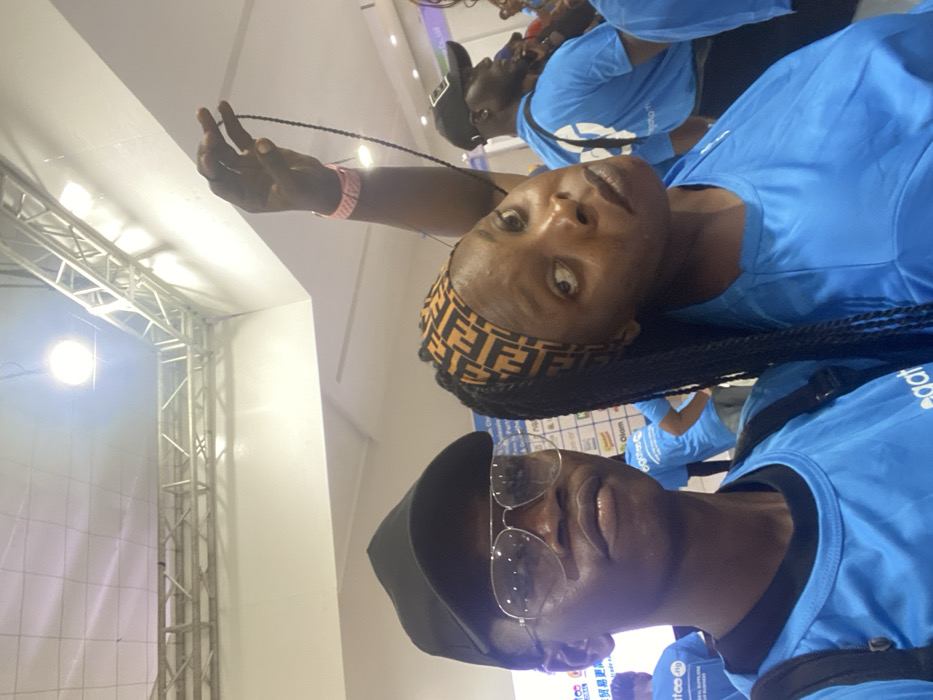 The image presents a close-up of two individuals within an indoor event space in Ikeja, Nigeria
