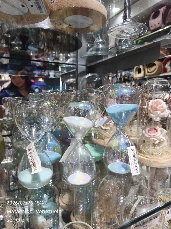 The image, captured on 2026/02/26 at 15:42 in Maracaibo, Venezuela, depicts an indoor retail display. The foreground and midground are filled with multiple clear, iridescent glass hourglasses, containing sand in shades of light blue, white, and iridescent white. Several hourglasses feature white paper tags with black barcodes attached. To the right, clear glass cloches or bell jars enclose artificial pink roses and dried botanical material, resting on light wooden bases. In the upper left, a person with dark hair, wearing a blue garment, is partially visible in reflection on a glass surface, appearing to observe items. The background consists of additional glass decorative items, some with wooden elements, arranged on shelving units. Blurred colorful merchandise and small decorative structures are discernible on shelves further into the background. The environment is brightly illuminated, generating numerous reflections on the glass surfaces and display shelves.