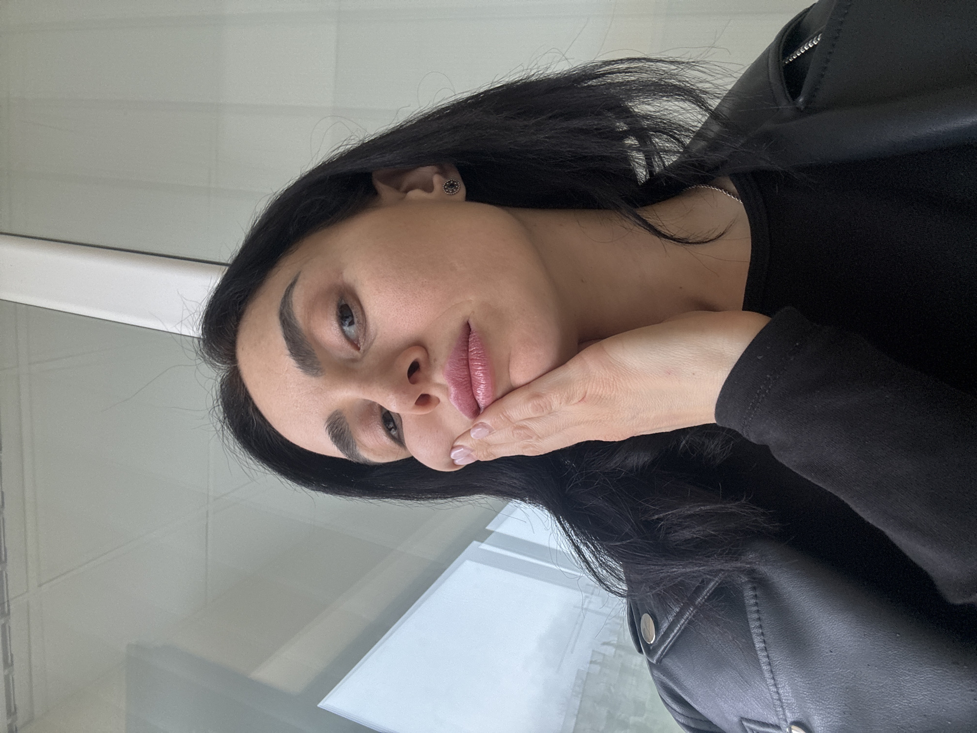 A woman with dark hair is resting her chin on her hand. She is wearing a black top and a black leather jacket with silver buttons. She has a small earring in her ear. The background appears to be a window with white panes. It is not possible to confirm the location of the image is in Tbilisi, Georgia from this image alone.