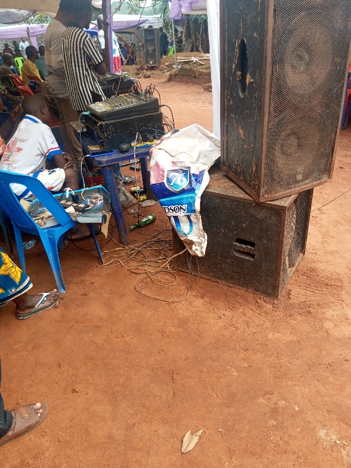 The scene depicts an outdoor gathering in Oko Town, Nigeria, characterized by a temporary event setup on reddish-brown earth. In the foreground, a person's feet in brown sandals are visible on the left. Moving right, a young male sits on a blue plastic chair, wearing a white t-shirt with a "76" logo and white shorts, his attention directed towards a device on a grey surface. Adjacent, a taller male in a black and white striped shirt stands behind a blue plastic table. The table supports a stack of audio equipment, including a multi-channel mixer and an amplifier, connected by numerous yellow and black cables tangled on the ground. A green glass bottle lies on its side beneath the table. To the right, two large, dark-colored audio speakers, showing signs of wear with metal grilles, are stacked vertically. A crumpled white plastic bag with a "76" logo and "DAVIDSON" text rests against the speakers. In the background, multiple people are visible under erected white and purple canopies, with further green foliage beyond. Another speaker is faintly visible under a distant canopy.