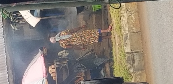 The image displays an outdoor scene in an unknown city, unknown region, featuring an adult female walking away from the camera, positioned slightly right of center. She wears a brown, orange, and yellow floral patterned dress, a light blue undergarment visible below the hem, a light-colored headscarf, and red flip-flops. To the left, a vendor's stall is present, covered by a pink and white striped umbrella canopy. Multiple loaf-shaped items, likely bread, are arranged on a wooden table beneath the canopy. Additional items are obscured by dark material underneath the table. Dense gray smoke or haze emanates from this area, partially obscuring the background. Behind the individual and to the right, a building with a corrugated metal roof and rough, light-colored walls is visible, featuring steps leading upwards. A green bucket is situated near the base of these steps. The foreground consists of an asphalt road, a concrete curb, and a strip of green grass. A dark vehicle tire and part of its metal structure are visible on the far left.